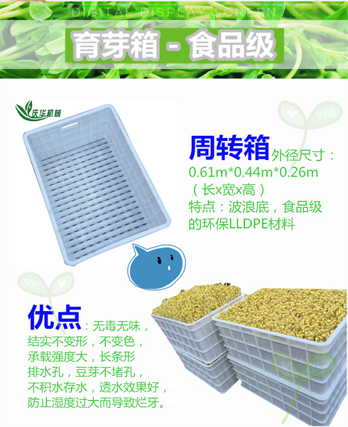 6、豆芽機結(jié)構(gòu)特點及功能(可根據(jù)客戶需要訂做): 4)周轉(zhuǎn)箱的外徑尺寸:0.61m*0.44m*0.26m(長寬高),特點:波浪底,食品級的環(huán)保LLDPE材料,無味,結(jié)實不變形,不變色,承載強度大,長條形排水孔,豆芽不堵孔,不積水存水,透水效果好,防止?jié)穸冗^大而導(dǎo)致爛牙。