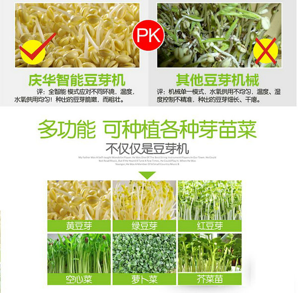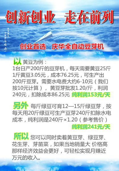 3、豆芽生產(chǎn)流程: 選擇芽豆 →→ 對豆種清洗并做無菌處理 →→ 浸種(適宜水溫) →→ 裝機(每箱約5斤干豆) →→ 啟動豆芽機,設(shè)定合理參數(shù) →→ 對育芽室做無菌處理 →→ 1天后觀察豆芽生長情況 →→ 2天后觀察豆芽生長情況 →→ 3天后觀察豆芽情況 →→ 4天后收獲豆芽 →→ 豆芽清洗后包裝,上市。